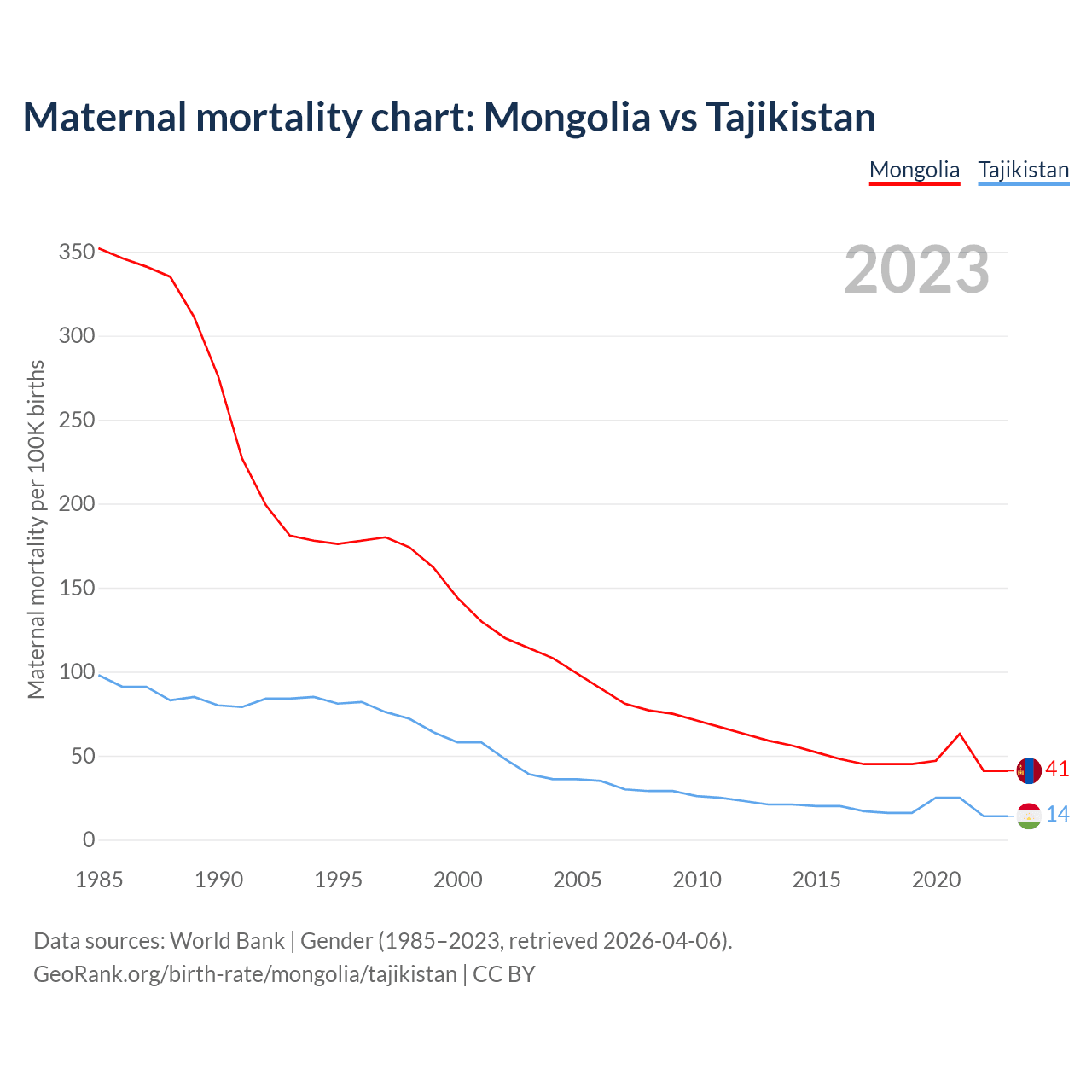 The maternal mortality rate, which is the probability of dying during childbirth or within 42 days of pregnancy termination, is 41 deaths per 100,000 live births in Mongolia, compared to 14 deaths in Tajikistan.