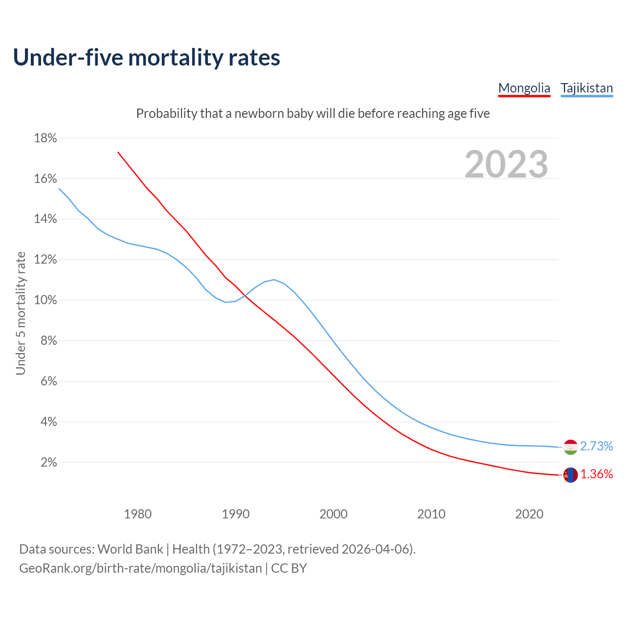The chance that a newborn baby will die before reaching age five is 1.36% in Mongolia and 2.73% in Tajikistan. Above is a chart with historical data on under-five mortality rates.