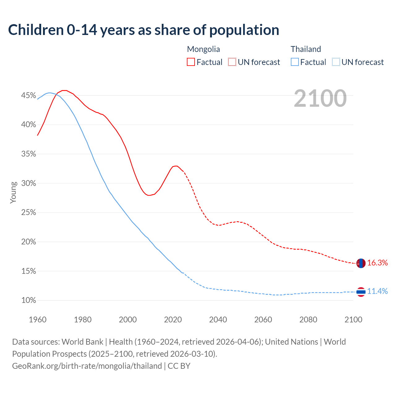 According to the latest available data on birth rates, the fertility rate in Mongolia was 2.7 children per woman in 2023, compared to 1.21 in Thailand in 2023. The replacement level is considered to be 2.1 children per woman.