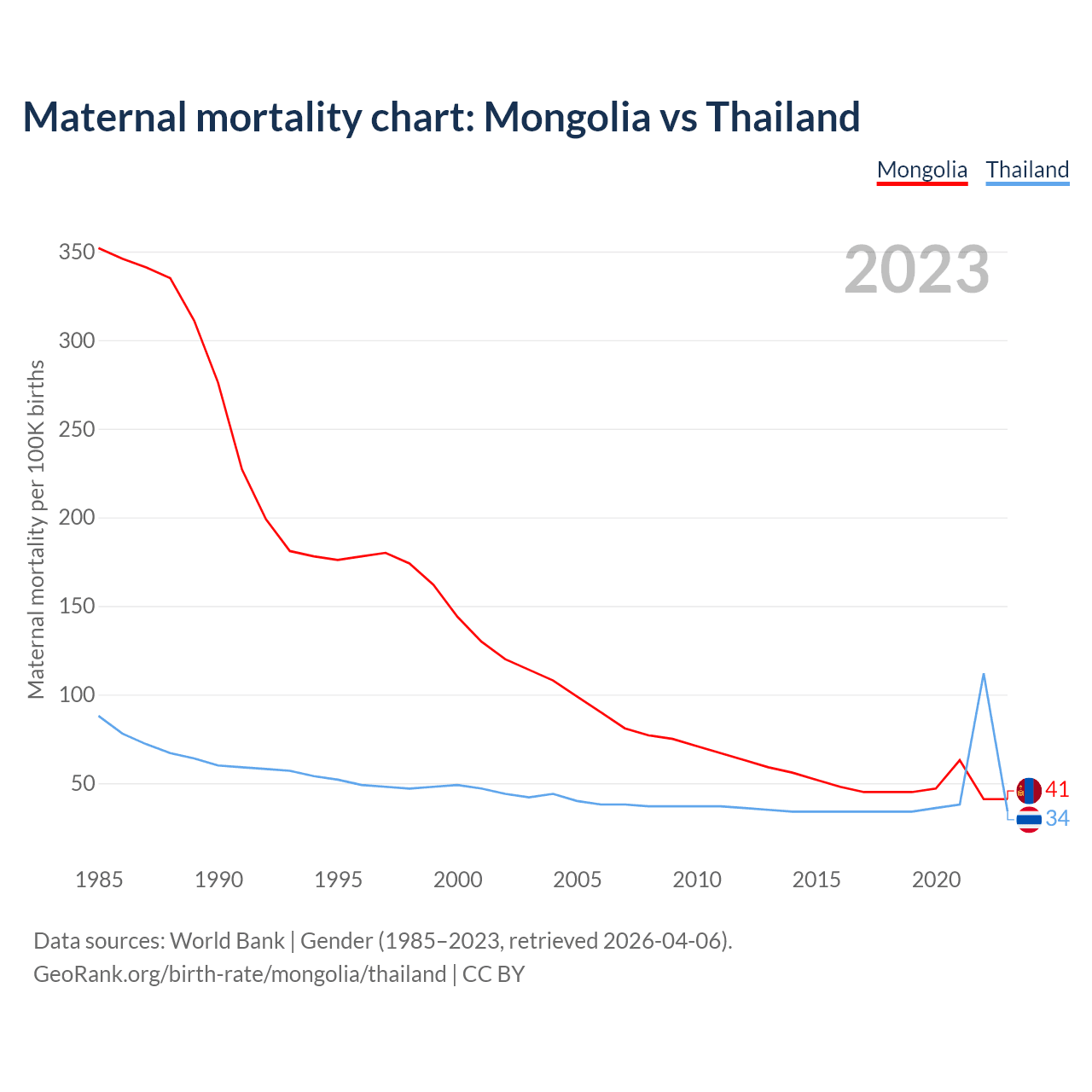 The maternal mortality rate, which is the probability of dying during childbirth or within 42 days of pregnancy termination, is 41 deaths per 100,000 live births in Mongolia, compared to 34 deaths in Thailand.