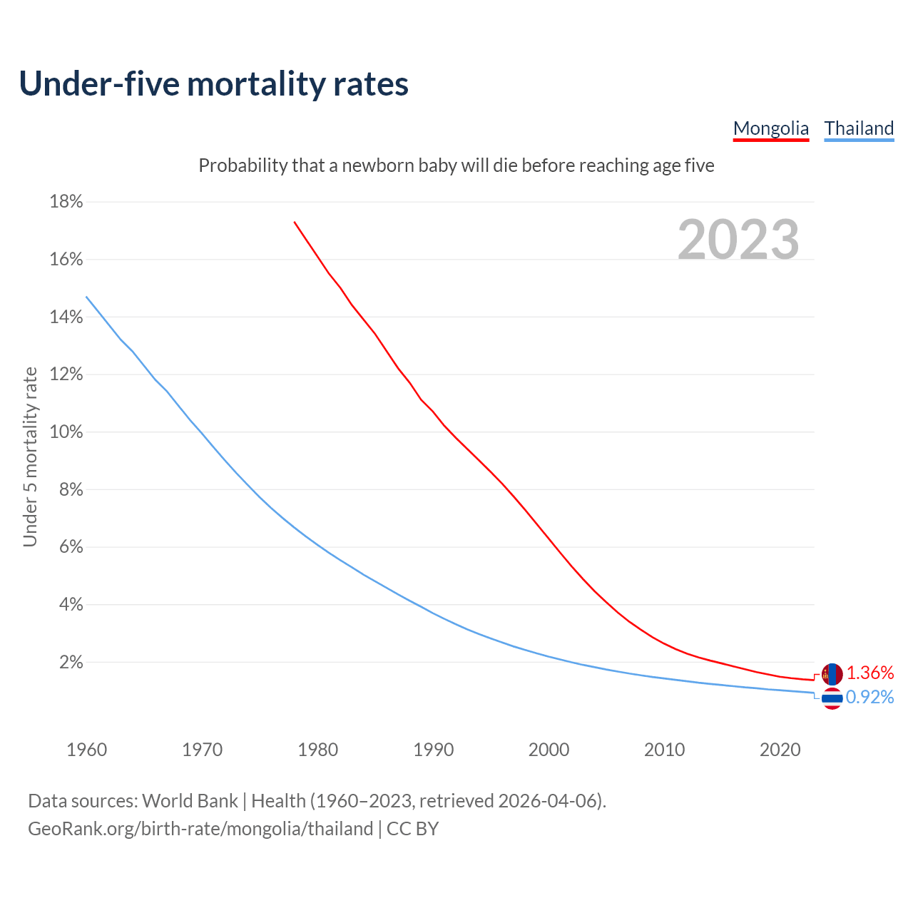The chance that a newborn baby will die before reaching age five is 1.36% in Mongolia and 0.92% in Thailand. Above is a chart with historical data on under-five mortality rates.