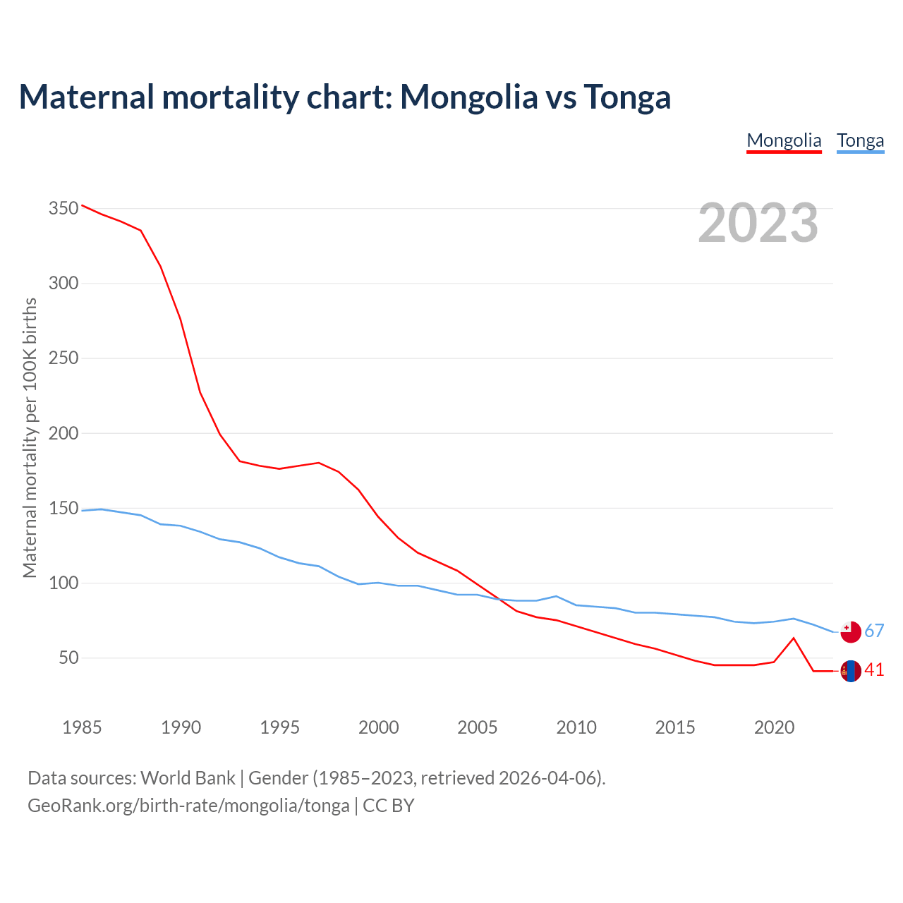 The maternal mortality rate, which is the probability of dying during childbirth or within 42 days of pregnancy termination, is 41 deaths per 100,000 live births in Mongolia, compared to 67 deaths in Tonga.
