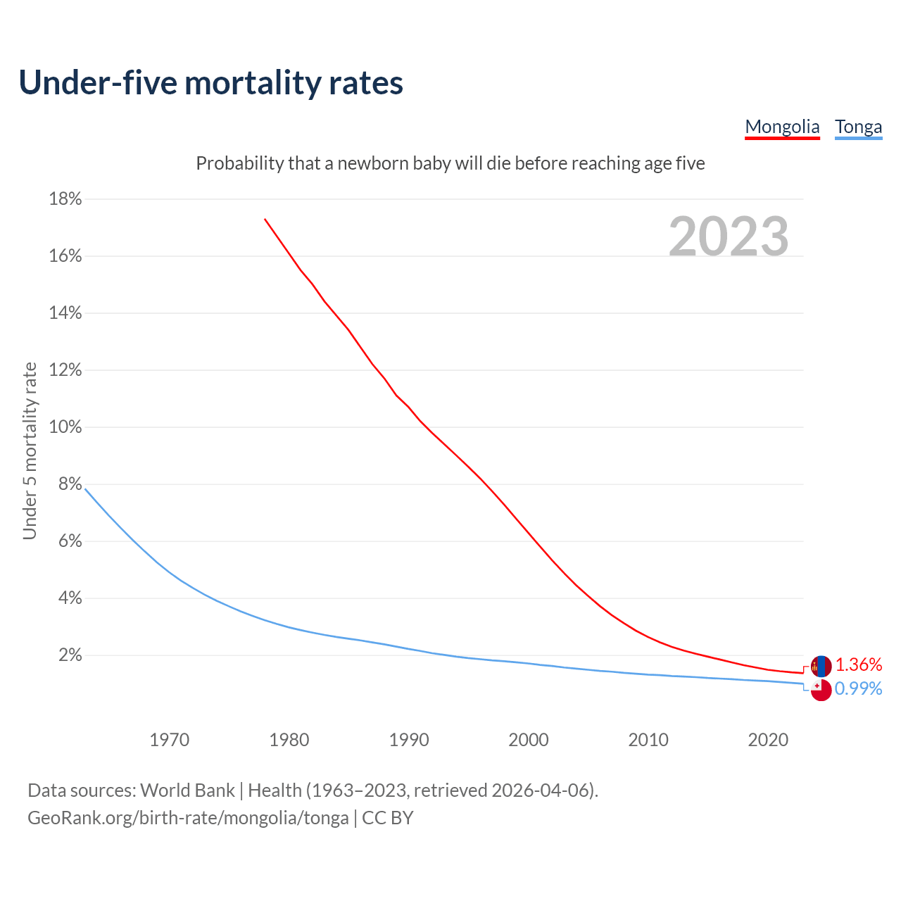 The chance that a newborn baby will die before reaching age five is 1.36% in Mongolia and 0.99% in Tonga. Above is a chart with historical data on under-five mortality rates.