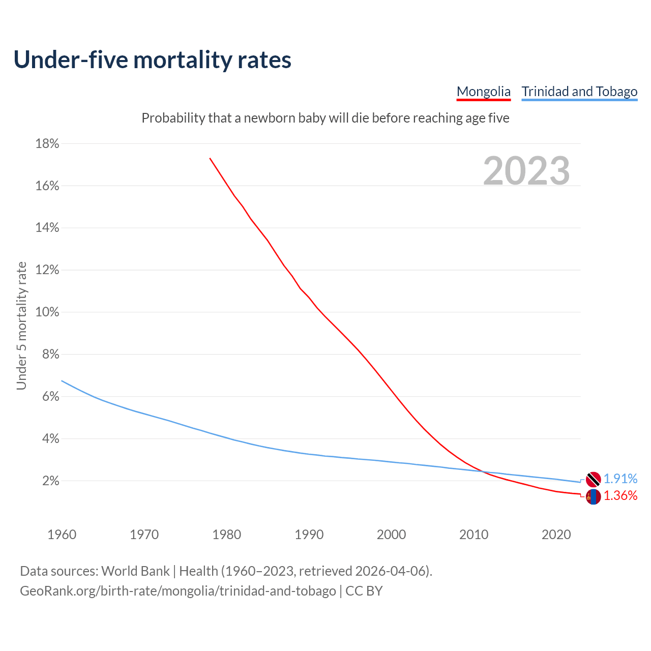 The chance that a newborn baby will die before reaching age five is 1.36% in Mongolia and 1.91% in Trinidad and Tobago. Above is a chart with historical data on under-five mortality rates.