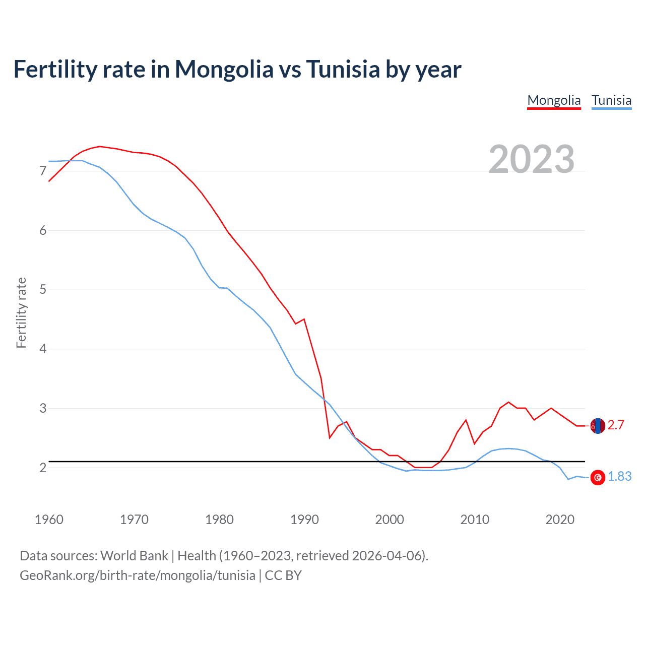 According to the latest available data on birth rates, the fertility rate in Mongolia was 2.7 children per woman in 2023, compared to 1.83 in Tunisia in 2023. The replacement level is considered to be 2.1 children per woman.