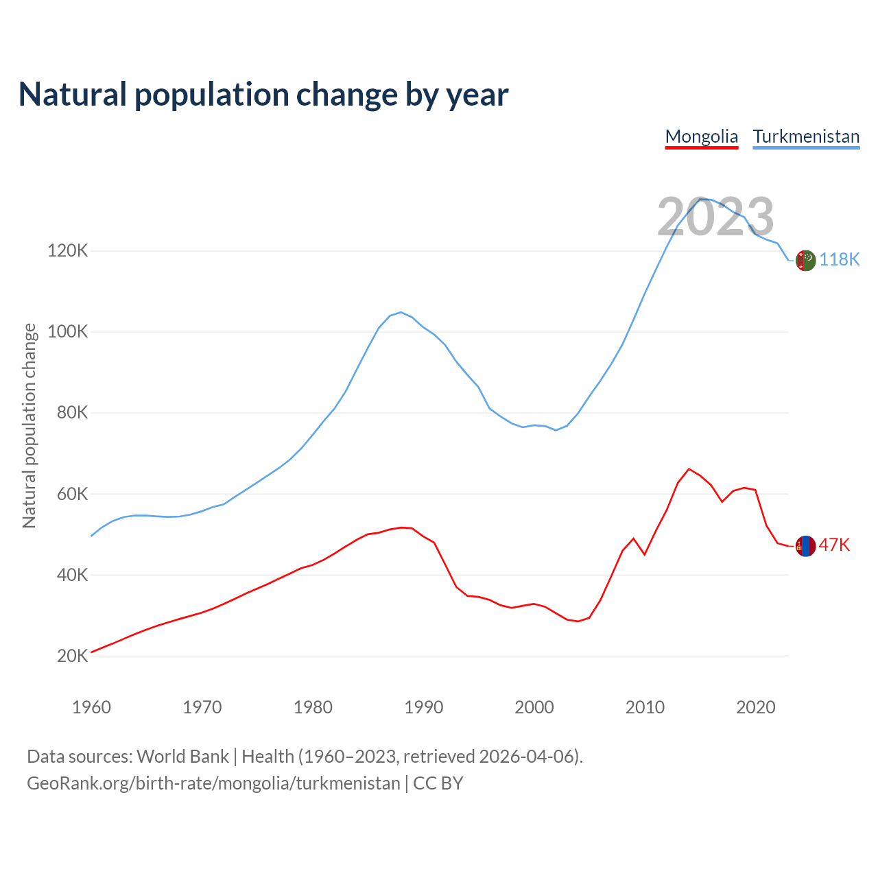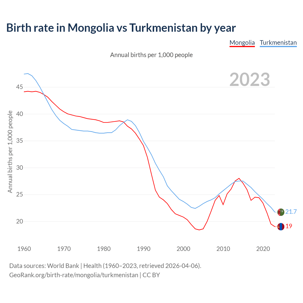 Mongolia has an annual birth rate of 19 births per 1,000 people, compared to 21.7 for Turkmenistan. The average number of children a woman is expected to have during her lifetime — the fertility rate, is 2.7 in Mongolia and 2.69 in Turkmenistan — 0.37% difference.