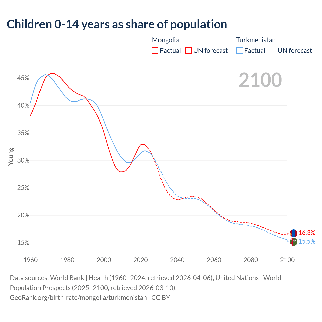 According to the latest available data on birth rates, the fertility rate in Mongolia was 2.7 children per woman in 2023, compared to 2.69 in Turkmenistan in 2023. The replacement level is considered to be 2.1 children per woman.