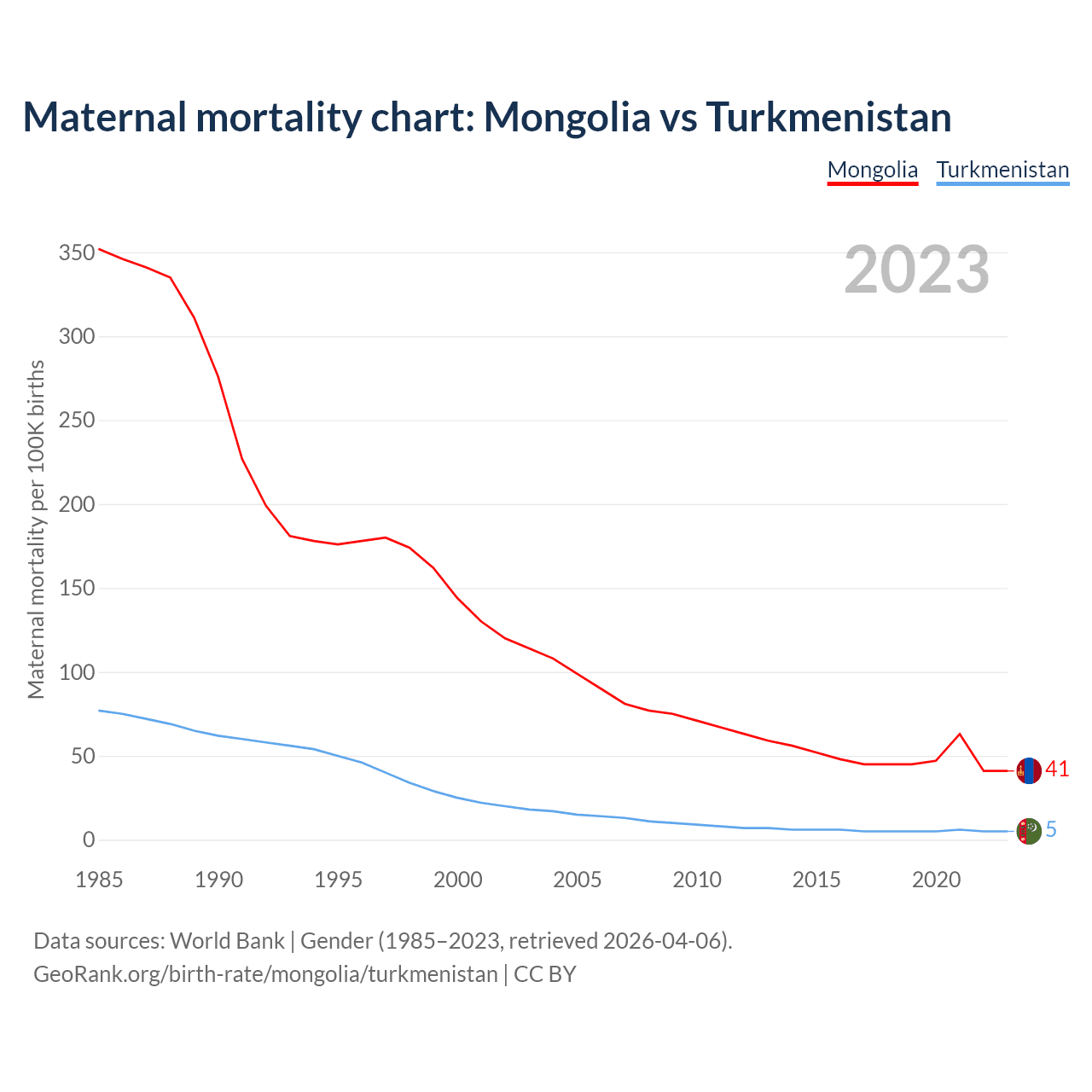 The maternal mortality rate, which is the probability of dying during childbirth or within 42 days of pregnancy termination, is 41 deaths per 100,000 live births in Mongolia, compared to 5 deaths in Turkmenistan.