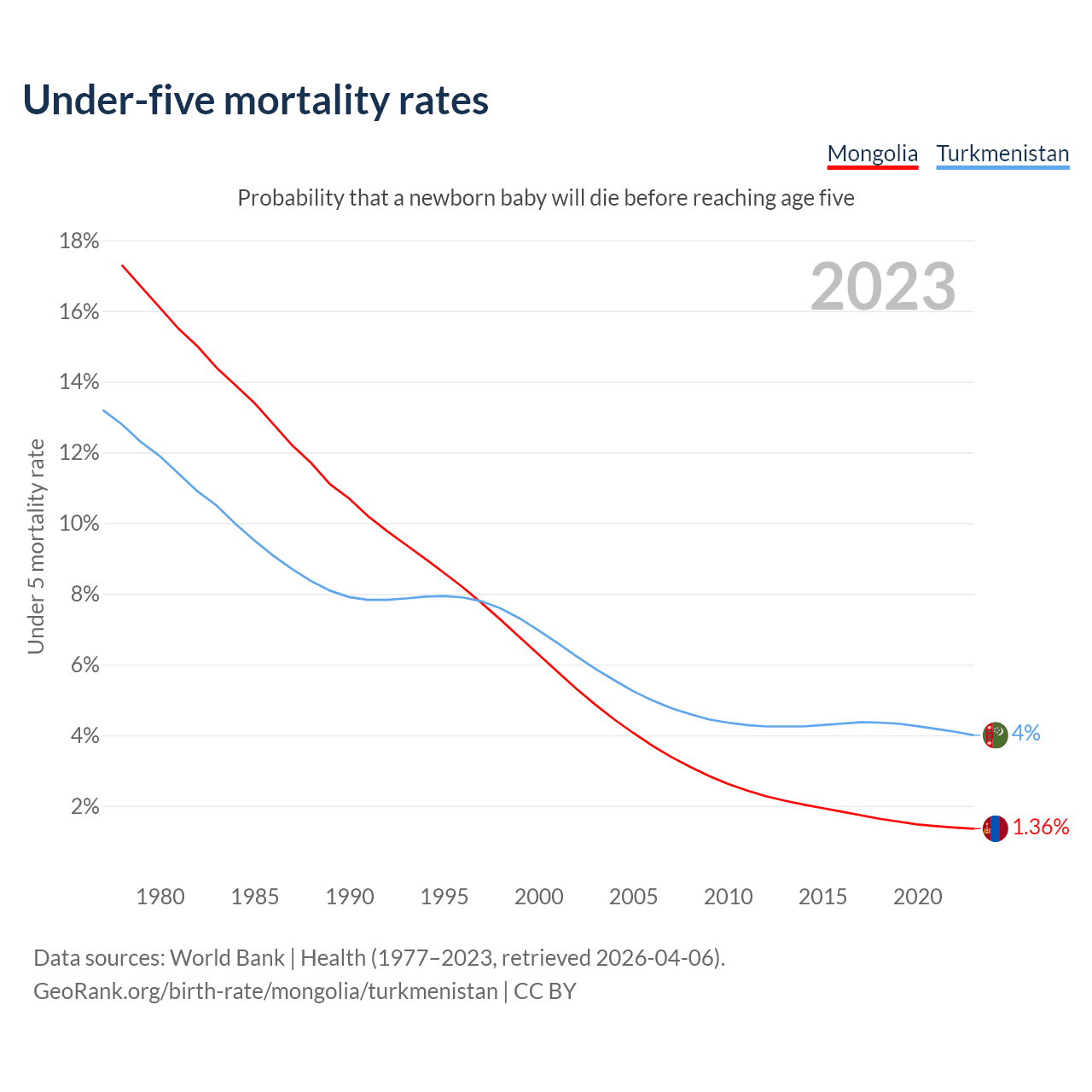 The chance that a newborn baby will die before reaching age five is 1.36% in Mongolia and 4% in Turkmenistan. Above is a chart with historical data on under-five mortality rates.