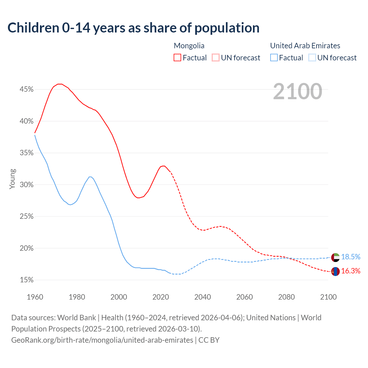 According to the latest available data on birth rates, the fertility rate in Mongolia was 2.7 children per woman in 2023, compared to 1.2 in the United Arab Emirates in 2023. The replacement level is considered to be 2.1 children per woman.
