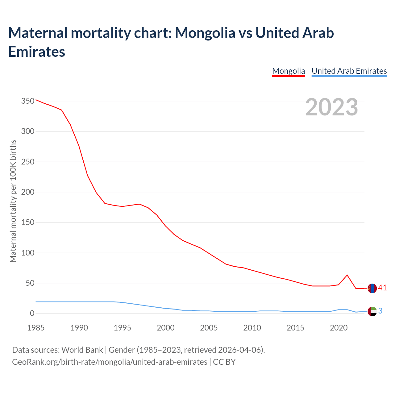 The maternal mortality rate, which is the probability of dying during childbirth or within 42 days of pregnancy termination, is 41 deaths per 100,000 live births in Mongolia, compared to 3 deaths in the United Arab Emirates.