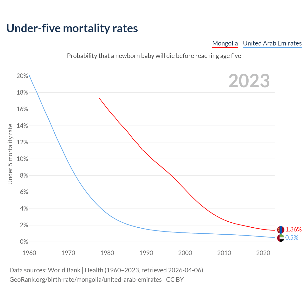 The chance that a newborn baby will die before reaching age five is 1.36% in Mongolia and 0.5% in the United Arab Emirates. Above is a chart with historical data on under-five mortality rates.