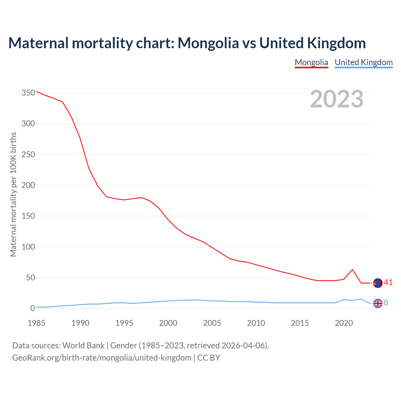 The maternal mortality rate, which is the probability of dying during childbirth or within 42 days of pregnancy termination, is 41 deaths per 100,000 live births in Mongolia, compared to 8 deaths in the United Kingdom.