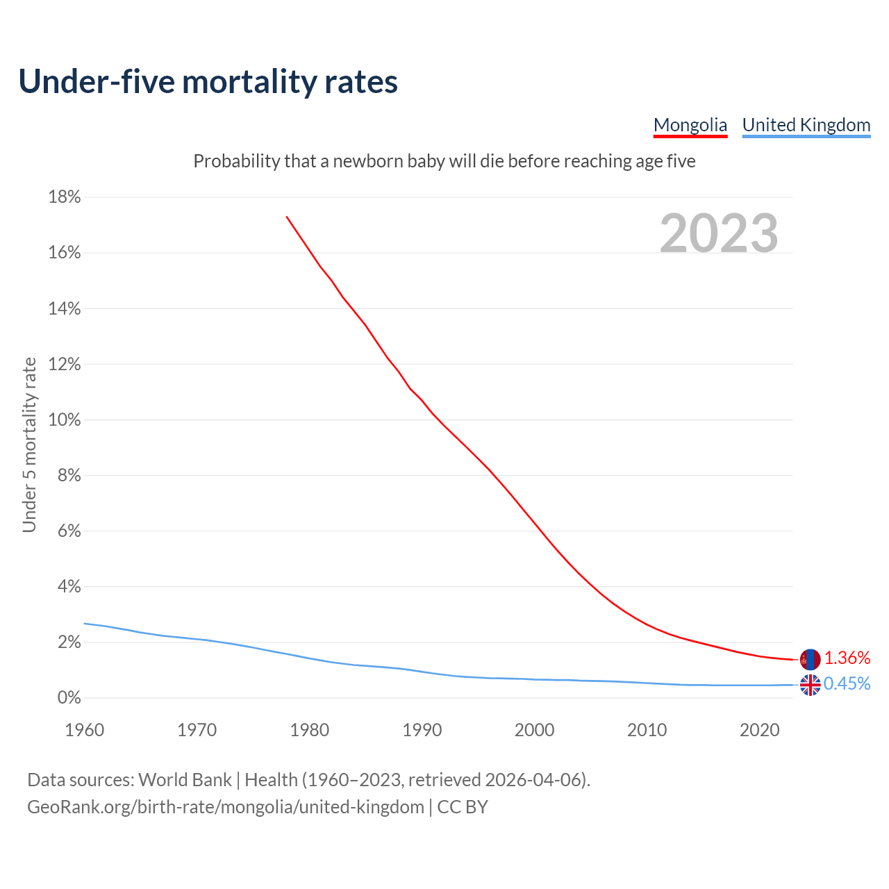 The chance that a newborn baby will die before reaching age five is 1.36% in Mongolia and 0.45% in the United Kingdom. Above is a chart with historical data on under-five mortality rates.