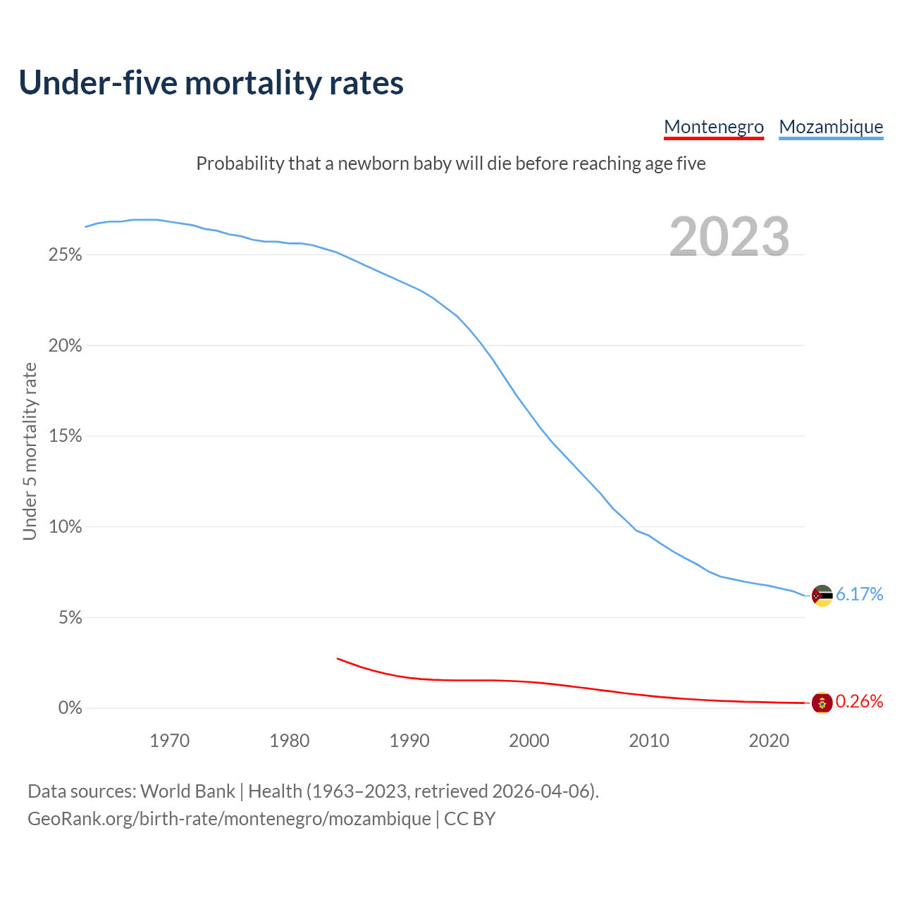 The chance that a newborn baby will die before reaching age five is 0.26% in Montenegro and 6.17% in Mozambique. Above is a chart with historical data on under-five mortality rates.