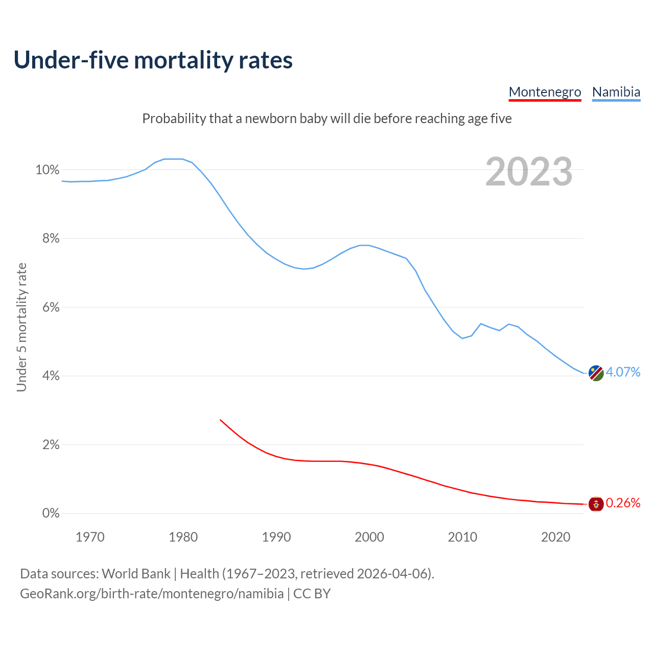The chance that a newborn baby will die before reaching age five is 0.26% in Montenegro and 4.07% in Namibia. Above is a chart with historical data on under-five mortality rates.