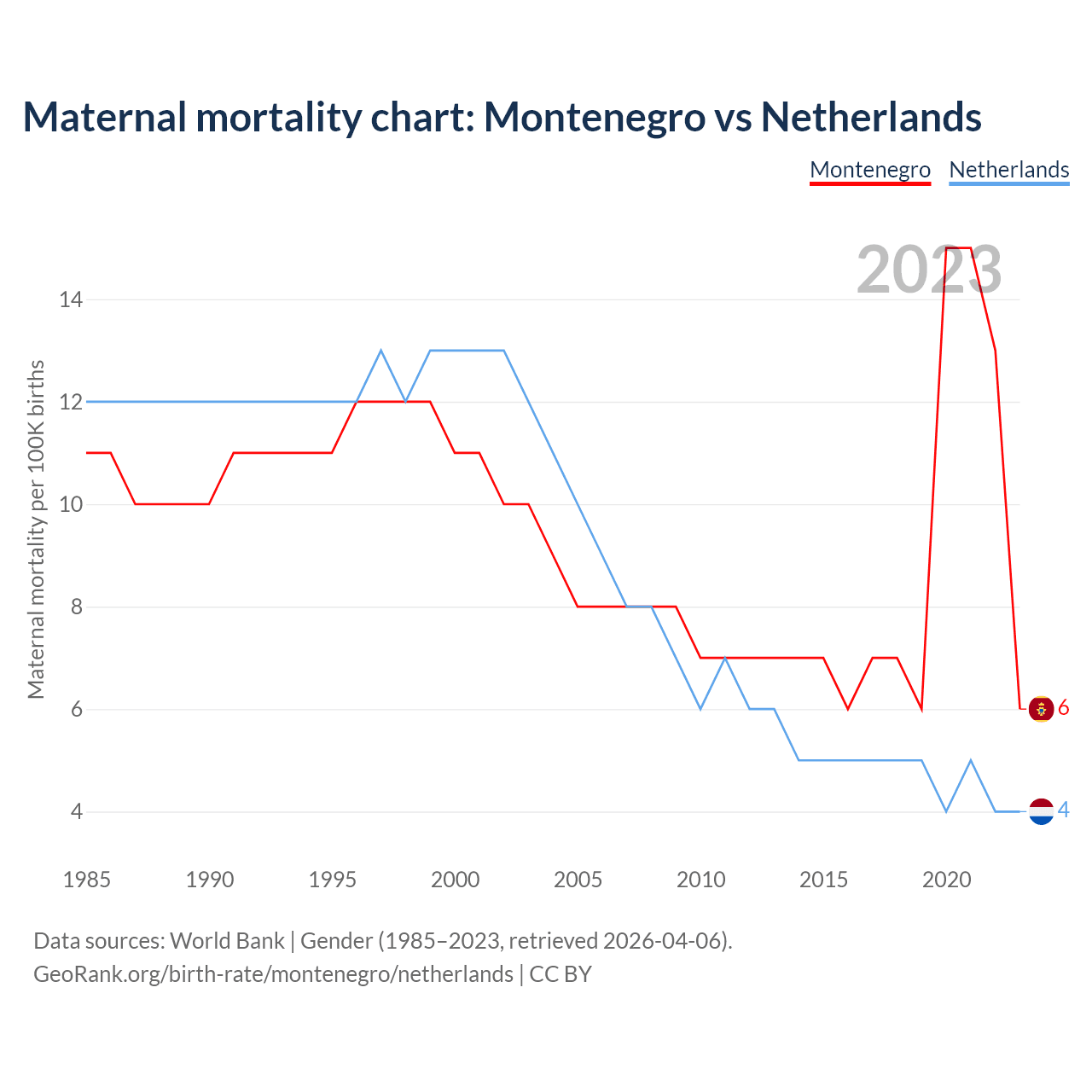The maternal mortality rate, which is the probability of dying during childbirth or within 42 days of pregnancy termination, is 6 deaths per 100,000 live births in Montenegro, compared to 4 deaths in the Netherlands.