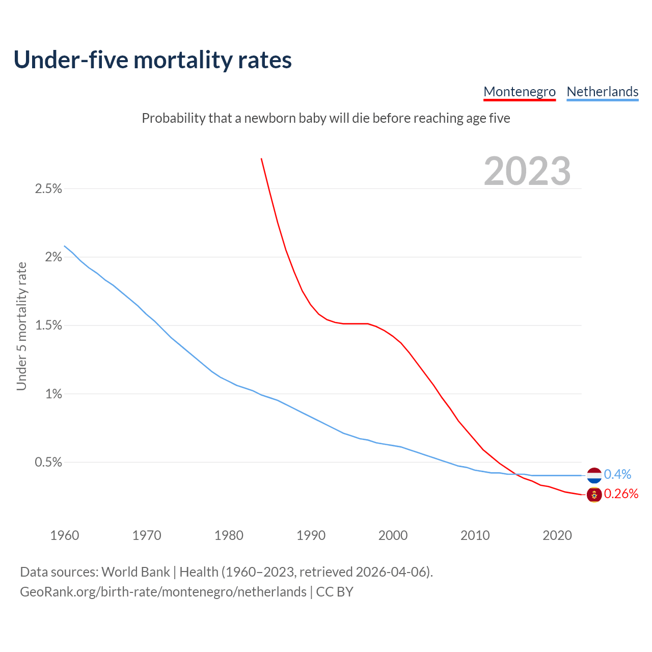 The chance that a newborn baby will die before reaching age five is 0.26% in Montenegro and 0.4% in the Netherlands. Above is a chart with historical data on under-five mortality rates.