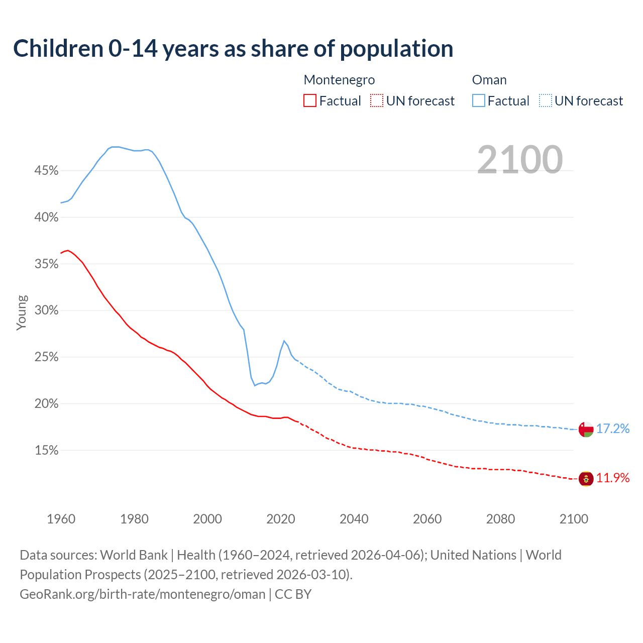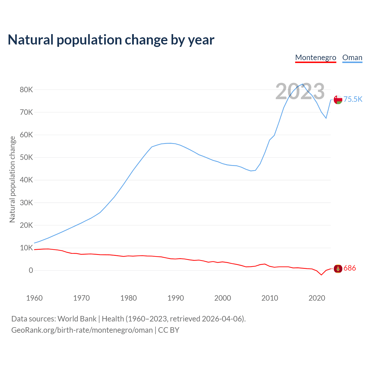 Montenegro has an annual birth rate of 11.2 births per 1,000 people, compared to 16.8 for Oman. The average number of children a woman is expected to have during her lifetime — the fertility rate, is 1.74 in Montenegro and 2.53 in Oman — 45.1% difference.