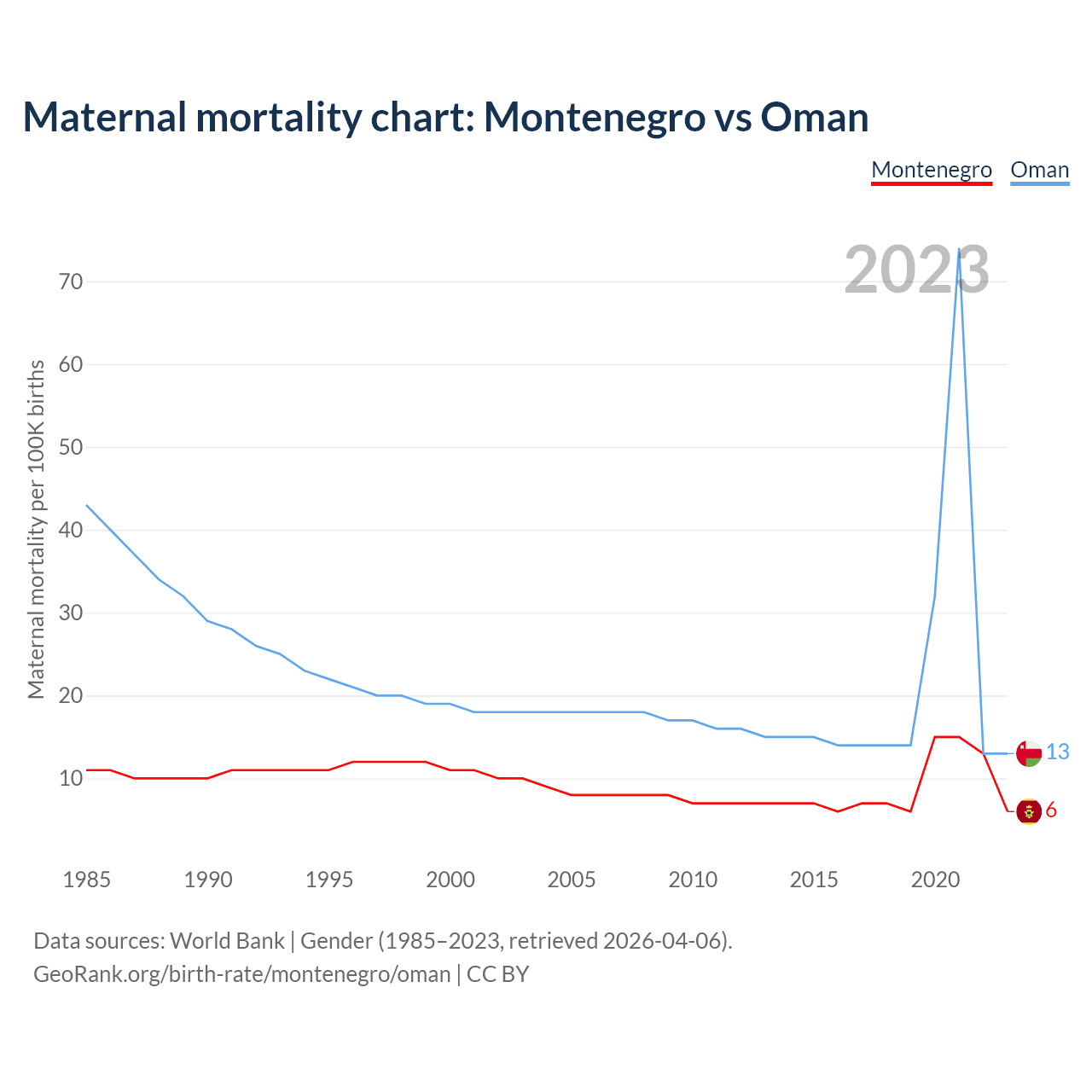 The maternal mortality rate, which is the probability of dying during childbirth or within 42 days of pregnancy termination, is 6 deaths per 100,000 live births in Montenegro, compared to 13 deaths in Oman.