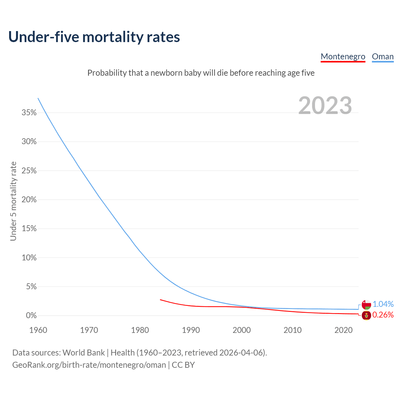 The chance that a newborn baby will die before reaching age five is 0.26% in Montenegro and 1.04% in Oman. Above is a chart with historical data on under-five mortality rates.