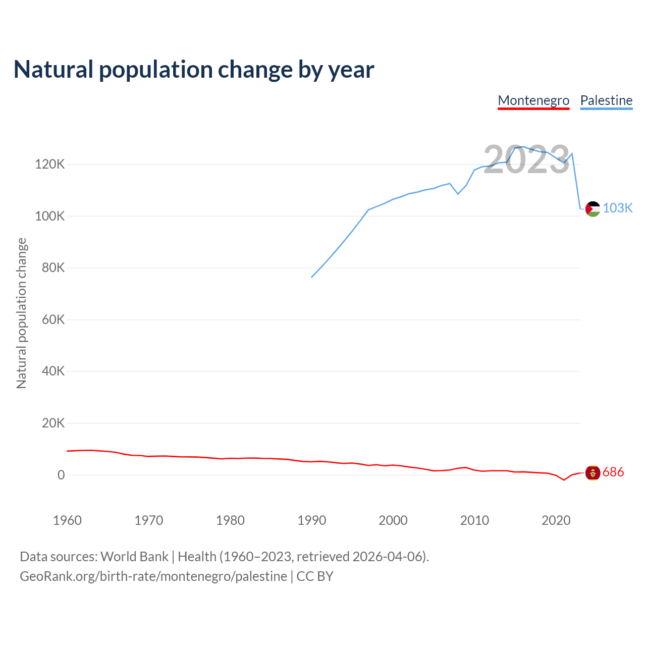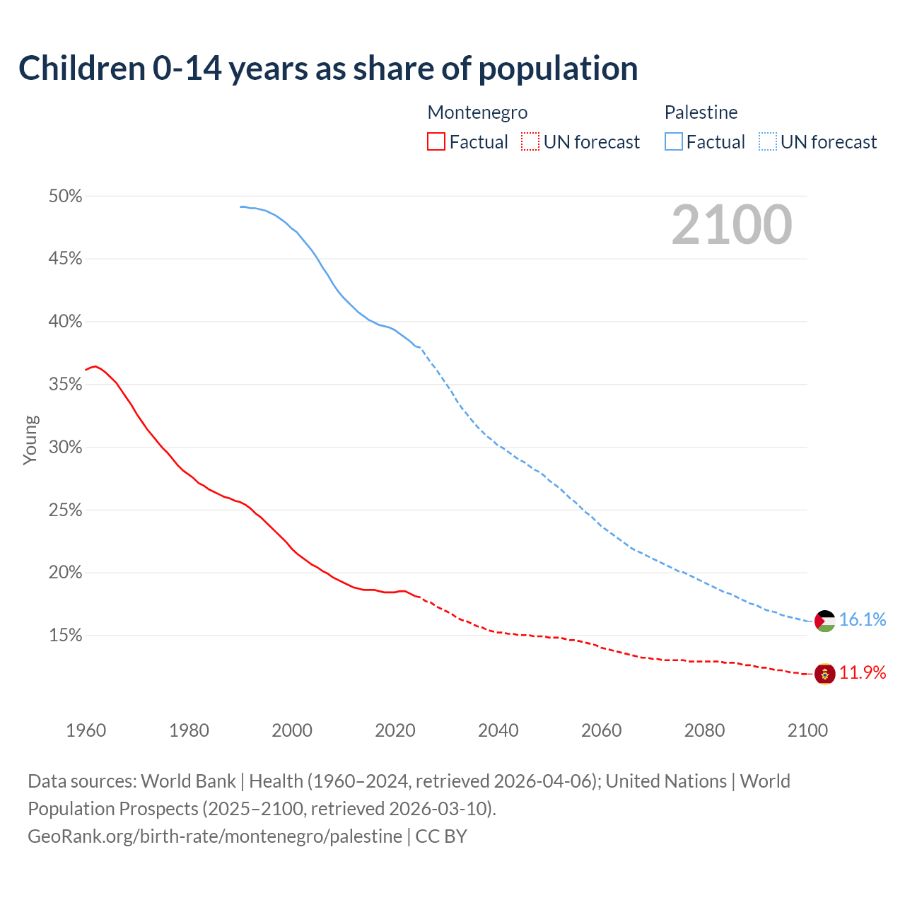 According to the latest available data on birth rates, the fertility rate in Montenegro was 1.74 children per woman in 2023, compared to 3.31 in Palestine in 2023. The replacement level is considered to be 2.1 children per woman.