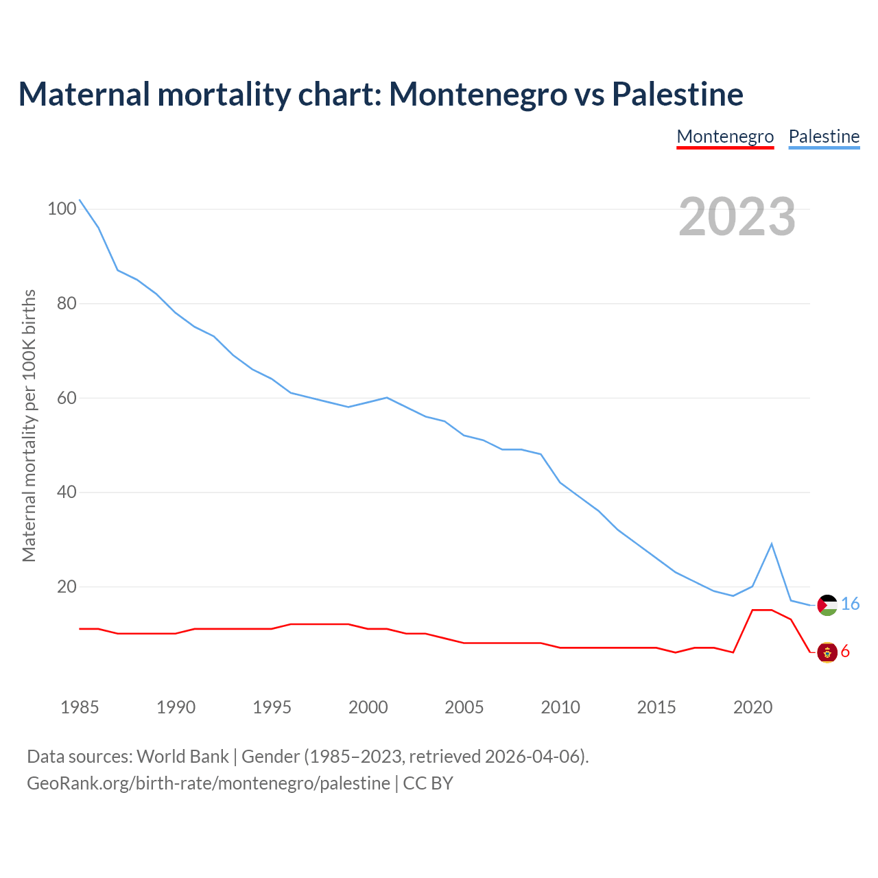 The maternal mortality rate, which is the probability of dying during childbirth or within 42 days of pregnancy termination, is 6 deaths per 100,000 live births in Montenegro, compared to 16 deaths in Palestine.