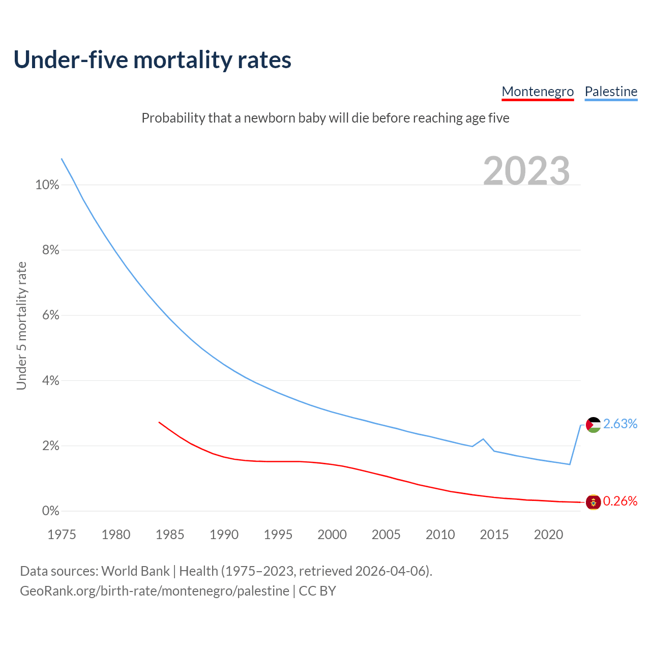 The chance that a newborn baby will die before reaching age five is 0.26% in Montenegro and 2.63% in Palestine. Above is a chart with historical data on under-five mortality rates.