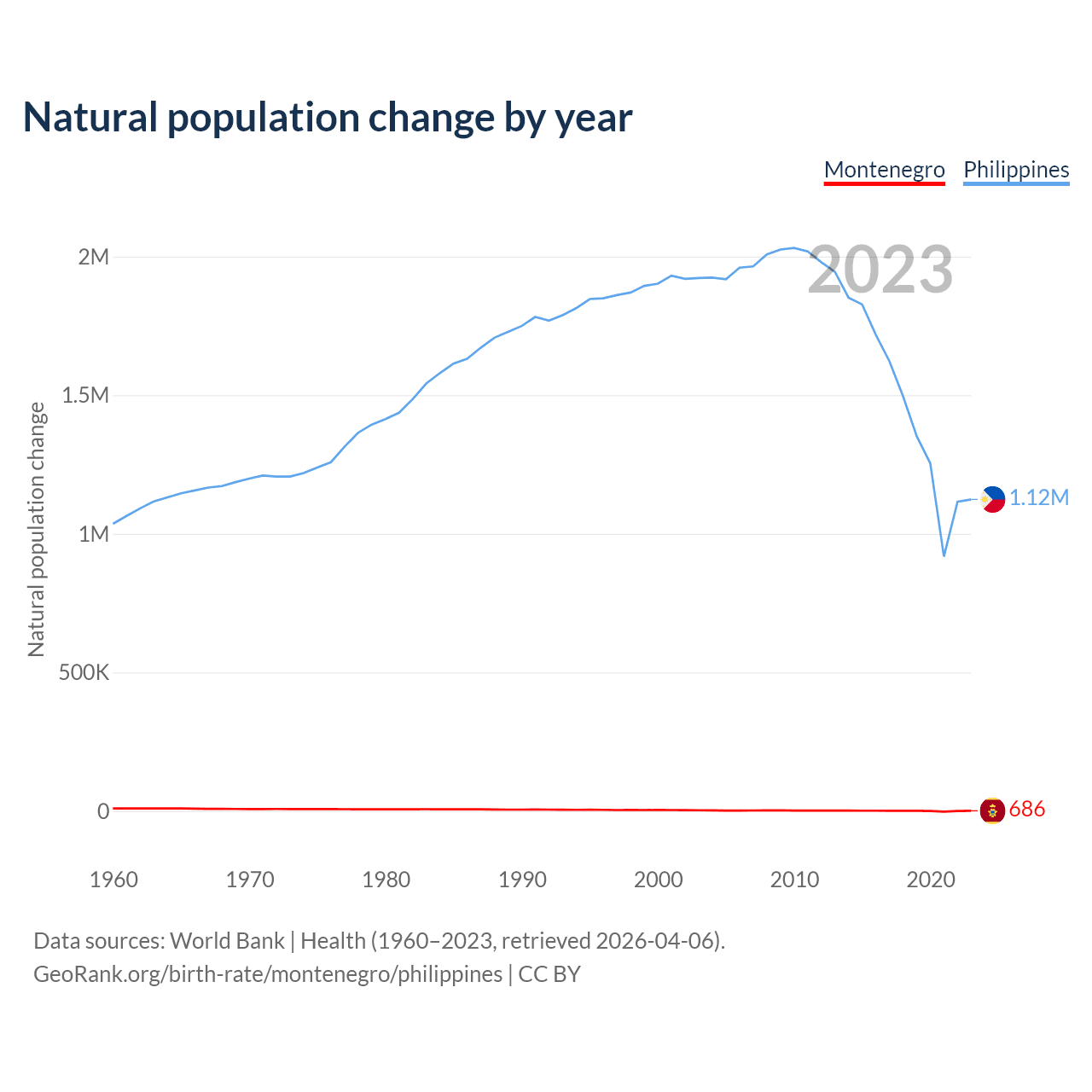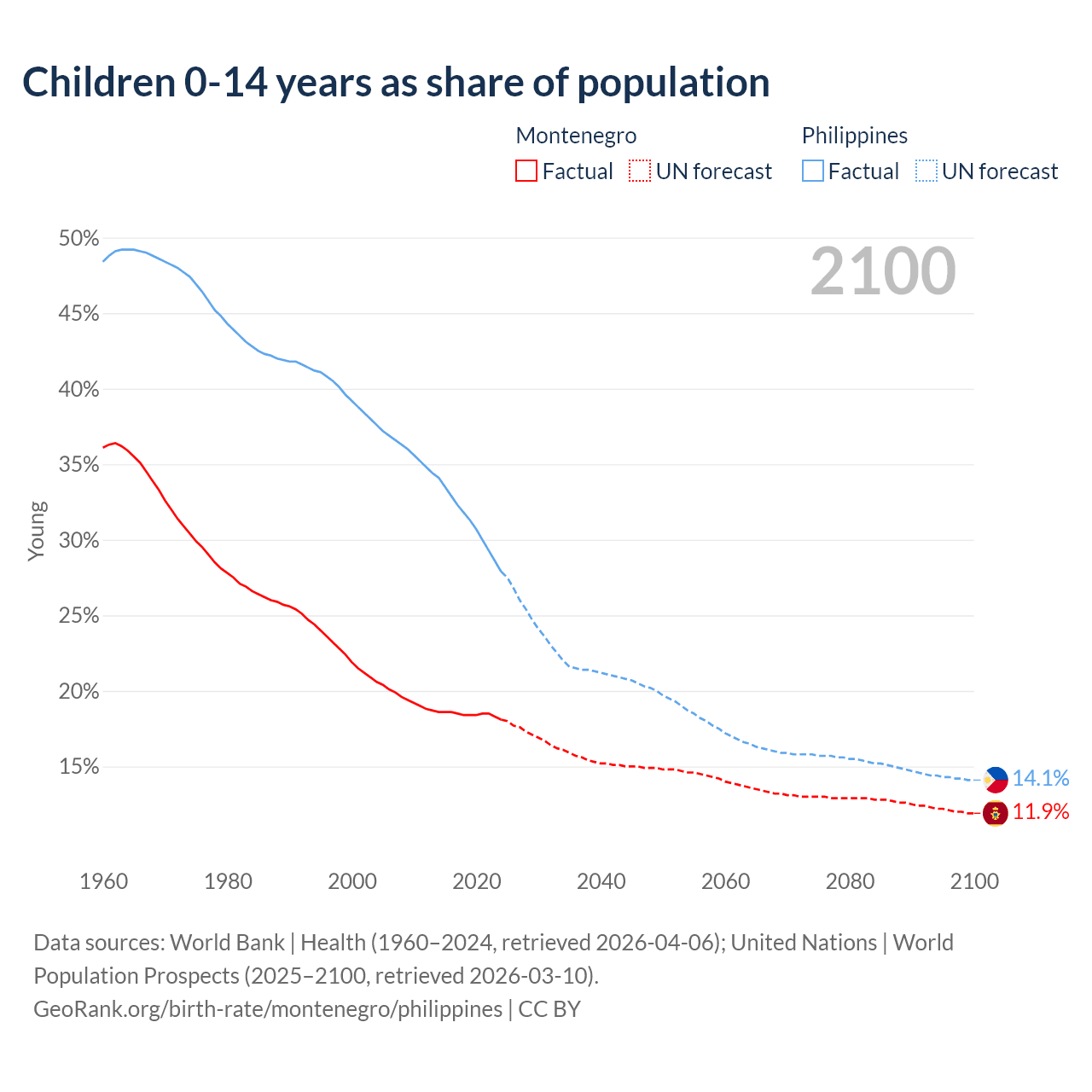 According to the latest available data on birth rates, the fertility rate in Montenegro was 1.74 children per woman in 2023, compared to 1.92 in the Philippines in 2023. The replacement level is considered to be 2.1 children per woman.