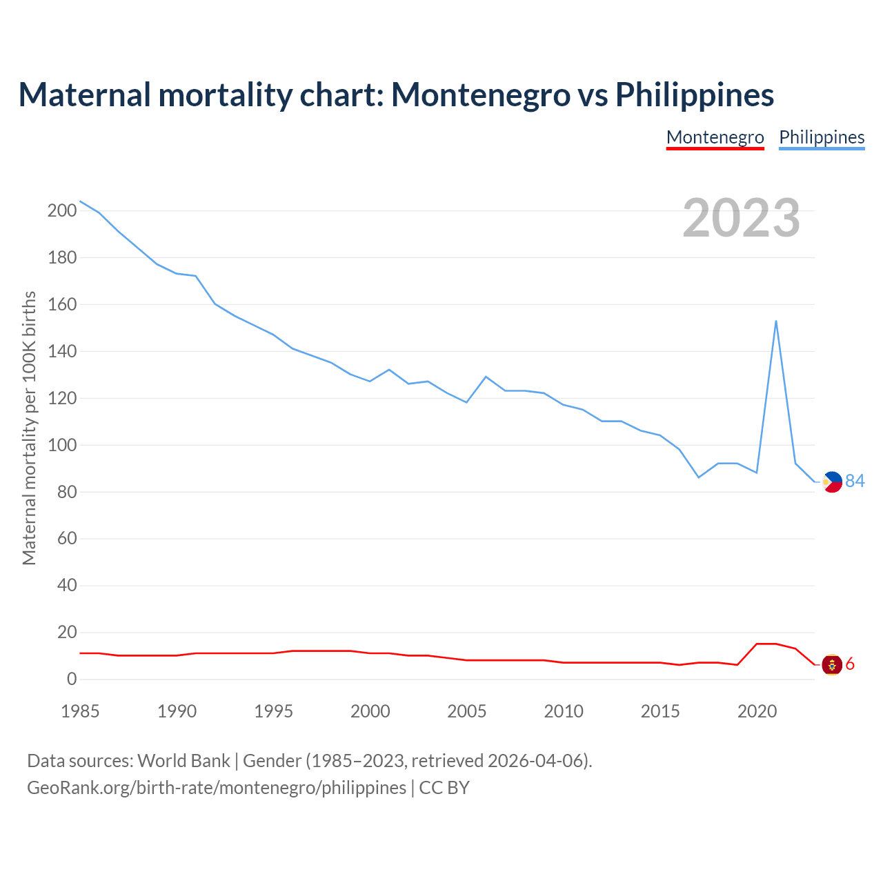 The maternal mortality rate, which is the probability of dying during childbirth or within 42 days of pregnancy termination, is 6 deaths per 100,000 live births in Montenegro, compared to 84 deaths in the Philippines.