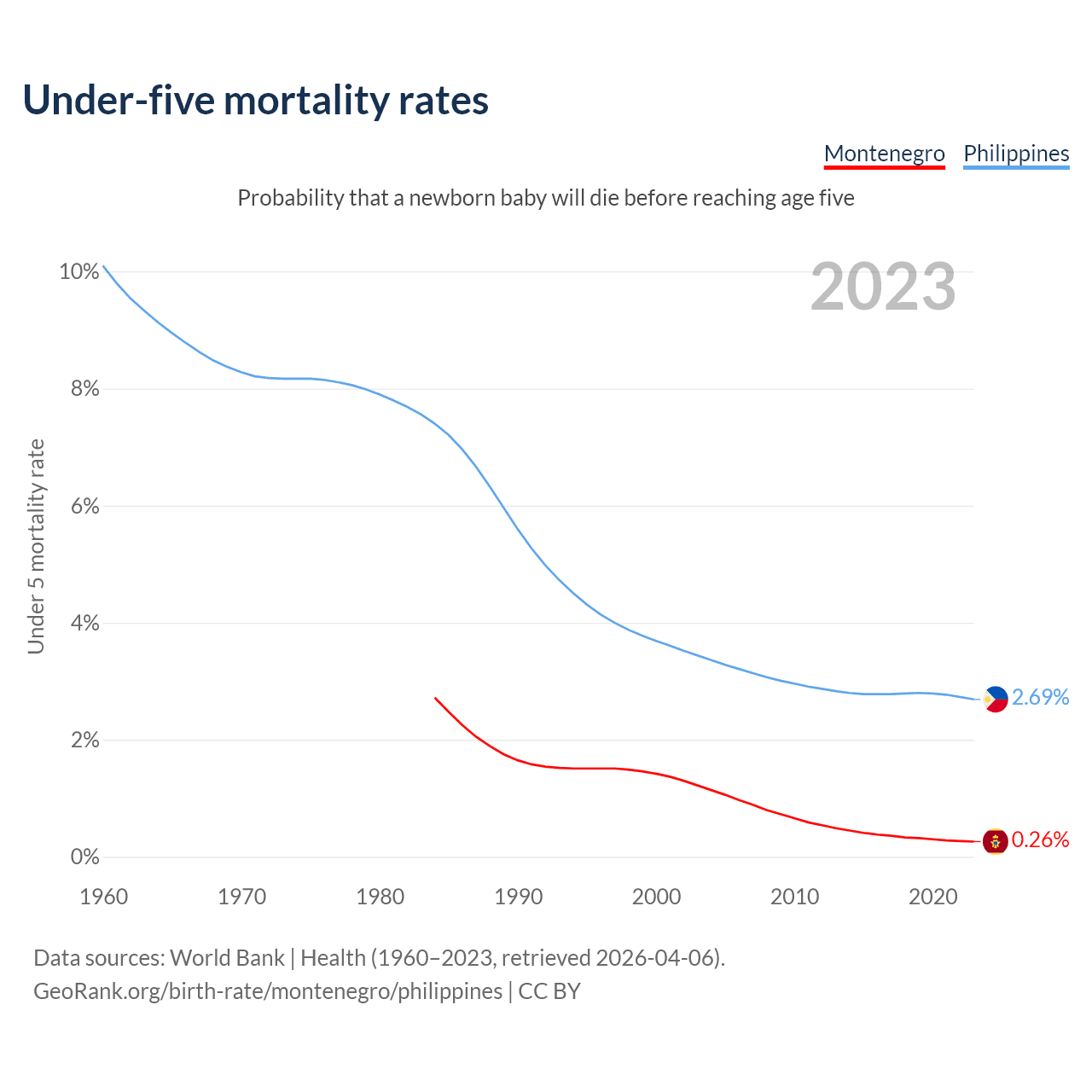 The chance that a newborn baby will die before reaching age five is 0.26% in Montenegro and 2.69% in the Philippines. Above is a chart with historical data on under-five mortality rates.