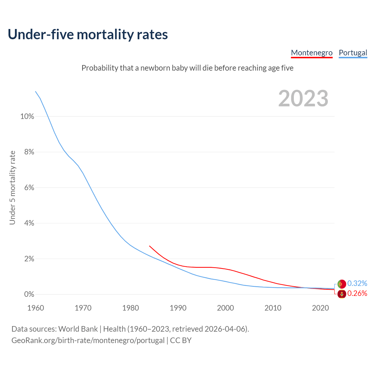 The chance that a newborn baby will die before reaching age five is 0.26% in Montenegro and 0.32% in Portugal. Above is a chart with historical data on under-five mortality rates.