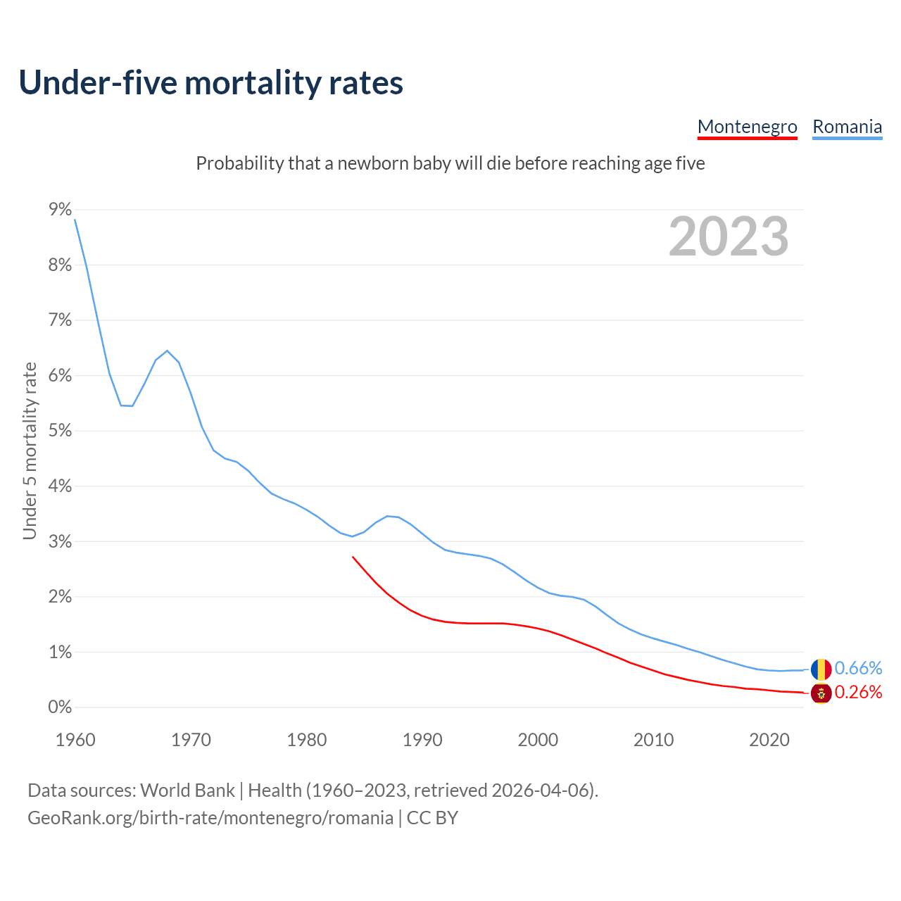 The chance that a newborn baby will die before reaching age five is 0.26% in Montenegro and 0.66% in Romania. Above is a chart with historical data on under-five mortality rates.