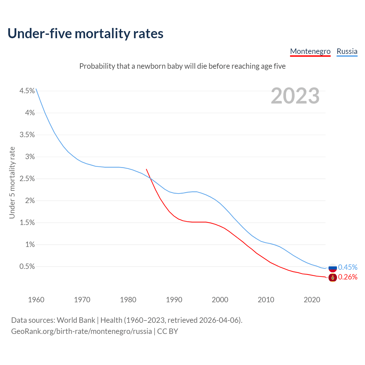 The chance that a newborn baby will die before reaching age five is 0.26% in Montenegro and 0.45% in Russia. Above is a chart with historical data on under-five mortality rates.