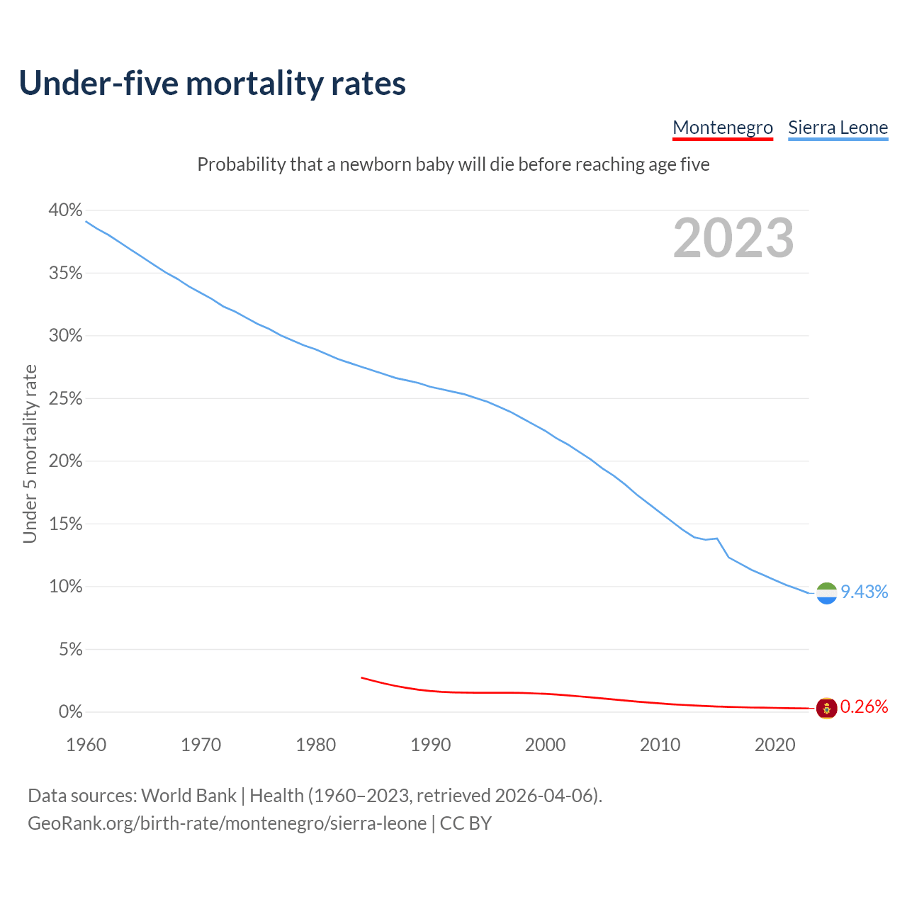 The chance that a newborn baby will die before reaching age five is 0.26% in Montenegro and 9.43% in Sierra Leone. Above is a chart with historical data on under-five mortality rates.