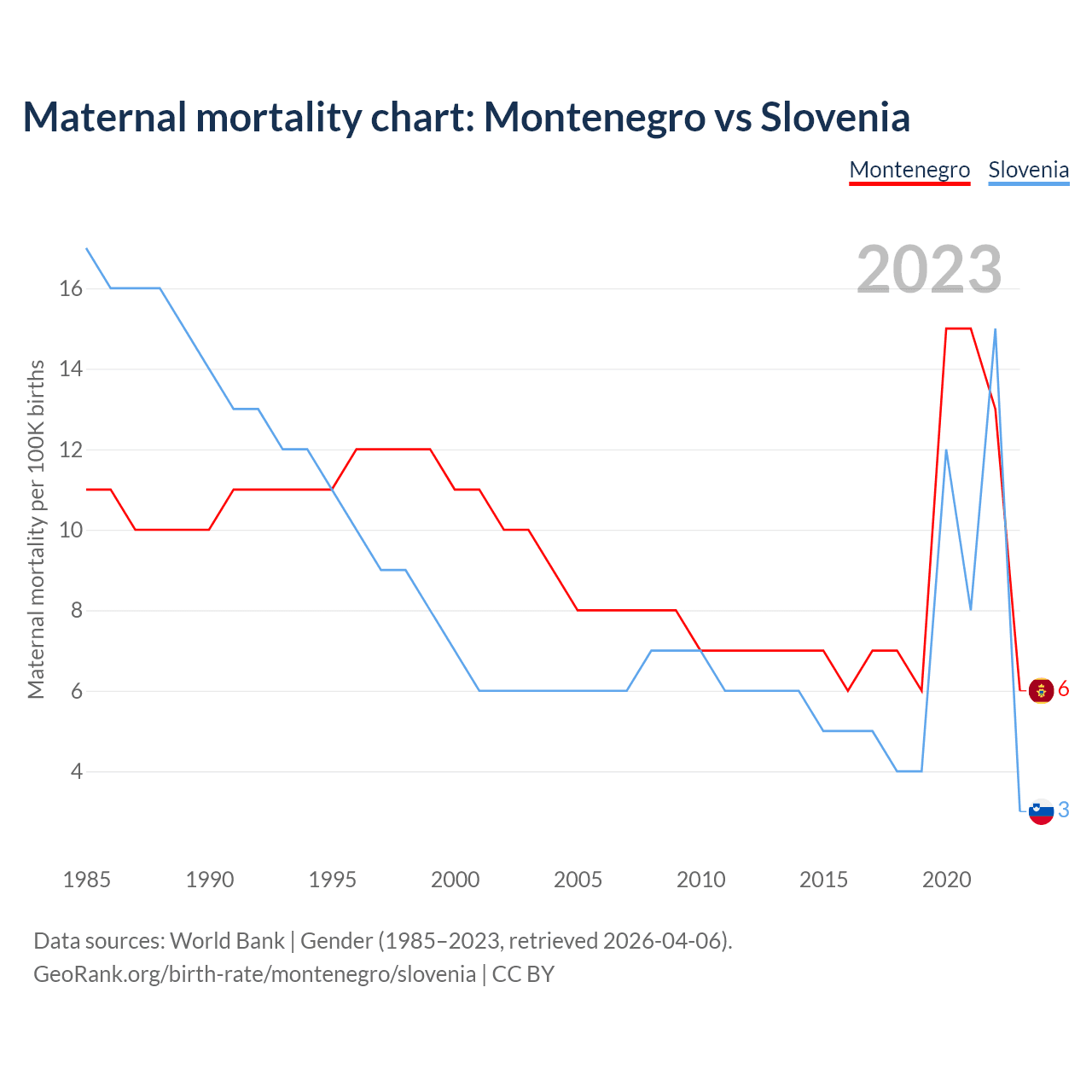 The maternal mortality rate, which is the probability of dying during childbirth or within 42 days of pregnancy termination, is 6 deaths per 100,000 live births in Montenegro, compared to 3 deaths in Slovenia.
