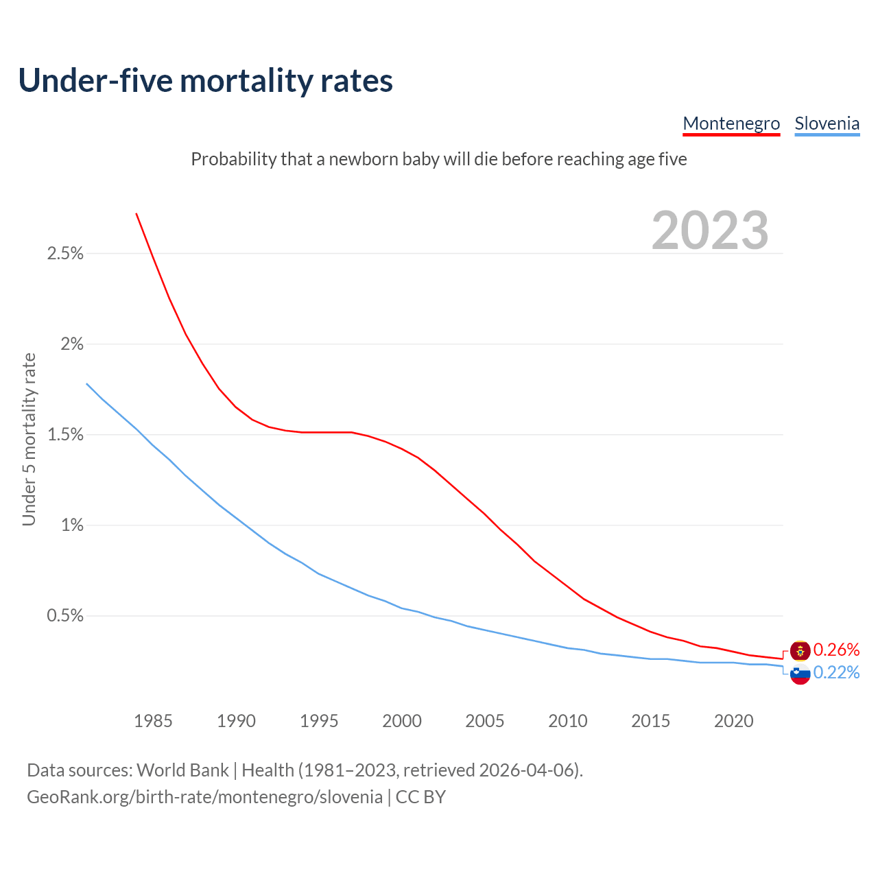 The chance that a newborn baby will die before reaching age five is 0.26% in Montenegro and 0.22% in Slovenia. Above is a chart with historical data on under-five mortality rates.