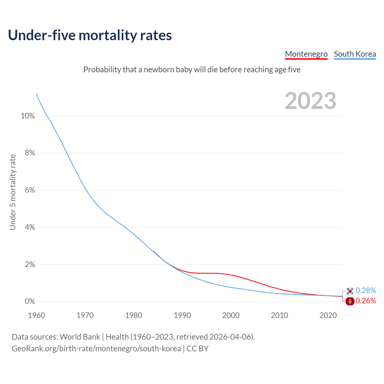 The chance that a newborn baby will die before reaching age five is 0.26% in Montenegro and 0.28% in South Korea. Above is a chart with historical data on under-five mortality rates.