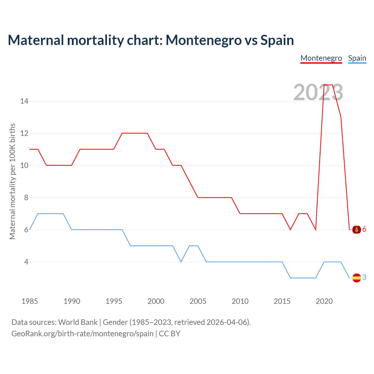 The maternal mortality rate, which is the probability of dying during childbirth or within 42 days of pregnancy termination, is 6 deaths per 100,000 live births in Montenegro, compared to 3 deaths in Spain.
