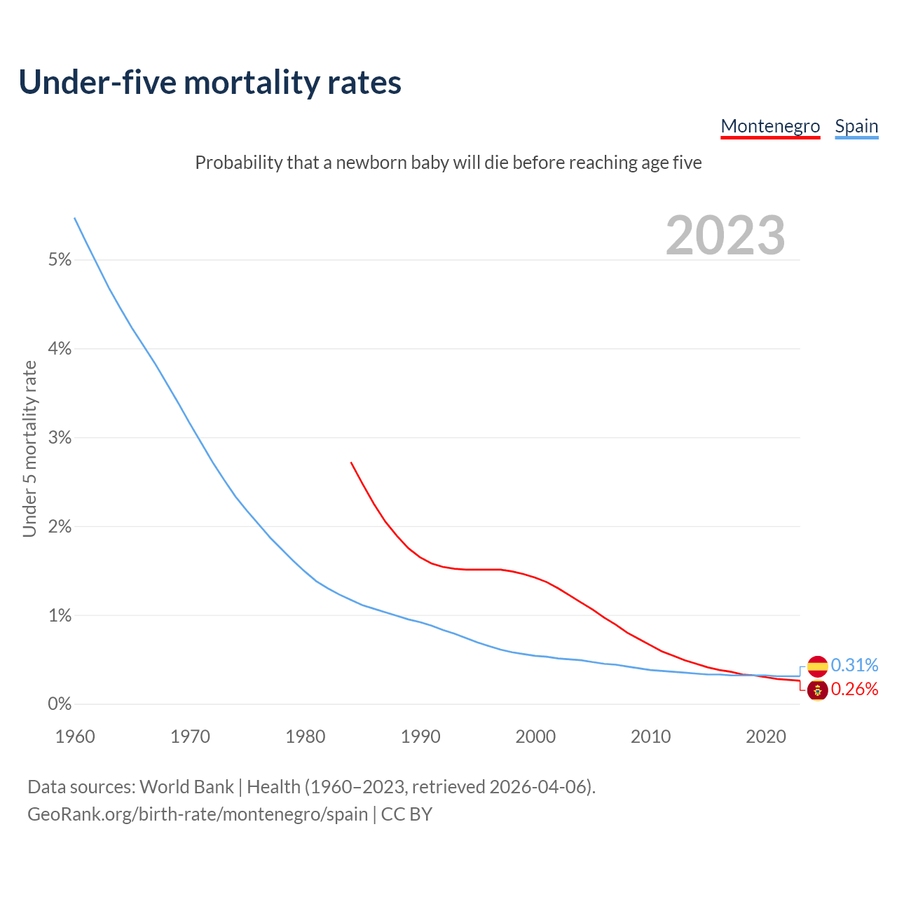 The chance that a newborn baby will die before reaching age five is 0.26% in Montenegro and 0.31% in Spain. Above is a chart with historical data on under-five mortality rates.