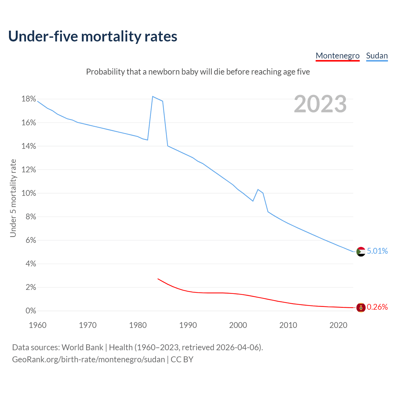The chance that a newborn baby will die before reaching age five is 0.26% in Montenegro and 5.01% in Sudan. Above is a chart with historical data on under-five mortality rates.