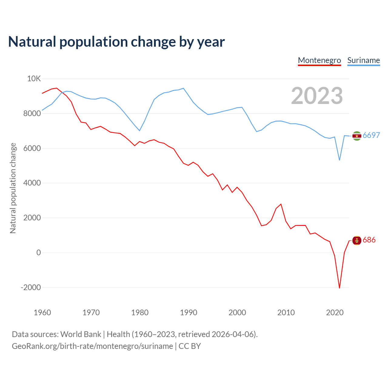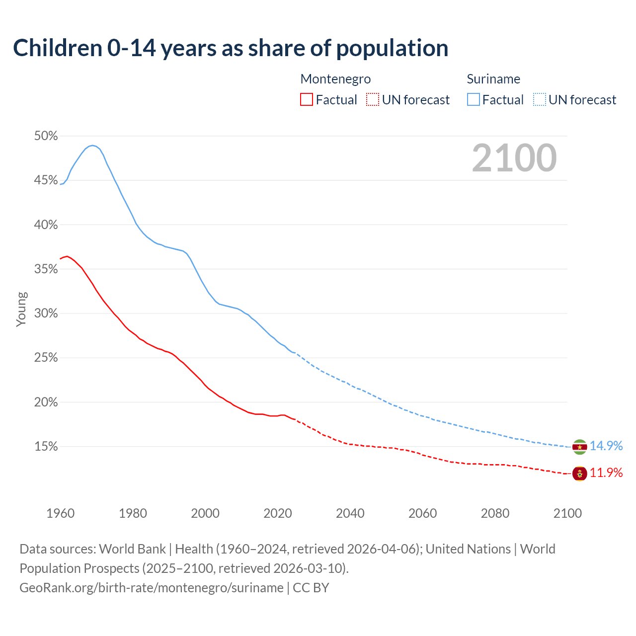 According to the latest available data on birth rates, the fertility rate in Montenegro was 1.74 children per woman in 2023, compared to 2.25 in Suriname in 2023. The replacement level is considered to be 2.1 children per woman.