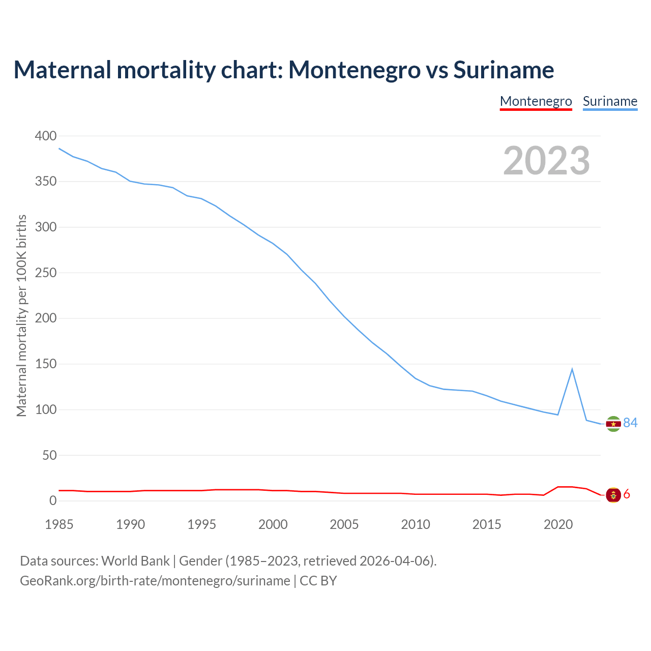 The maternal mortality rate, which is the probability of dying during childbirth or within 42 days of pregnancy termination, is 6 deaths per 100,000 live births in Montenegro, compared to 84 deaths in Suriname.