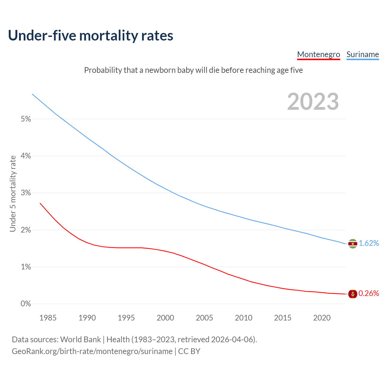 The chance that a newborn baby will die before reaching age five is 0.26% in Montenegro and 1.62% in Suriname. Above is a chart with historical data on under-five mortality rates.