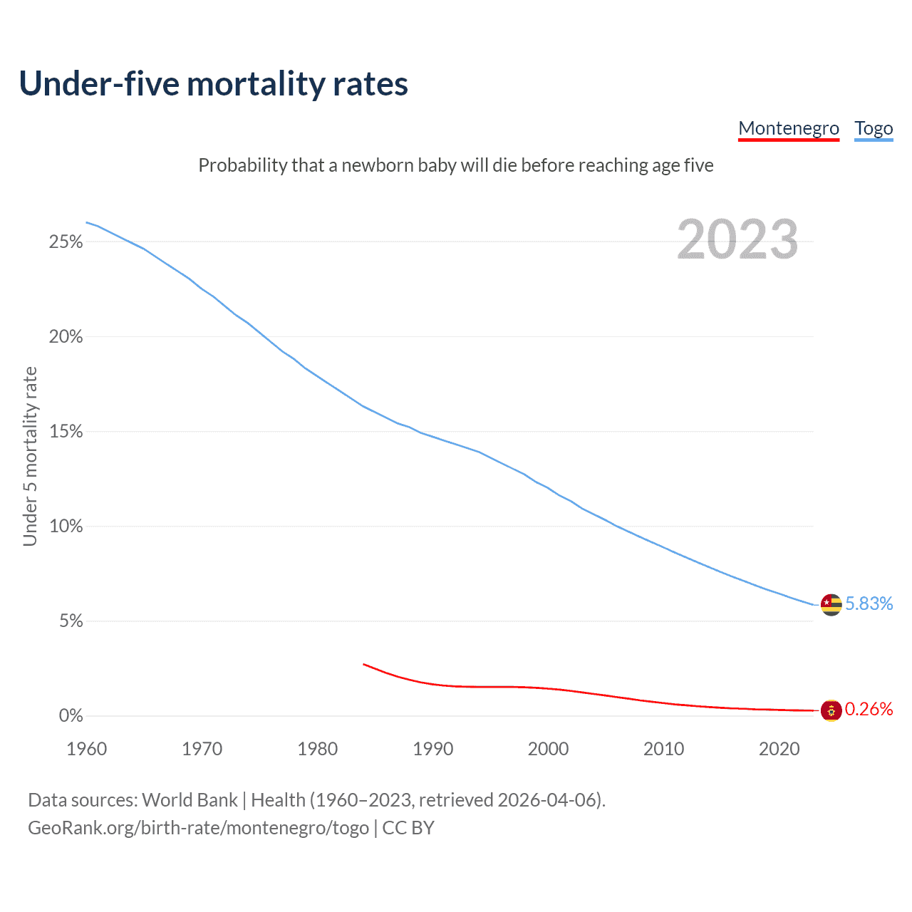 The chance that a newborn baby will die before reaching age five is 0.26% in Montenegro and 5.83% in Togo. Above is a chart with historical data on under-five mortality rates.