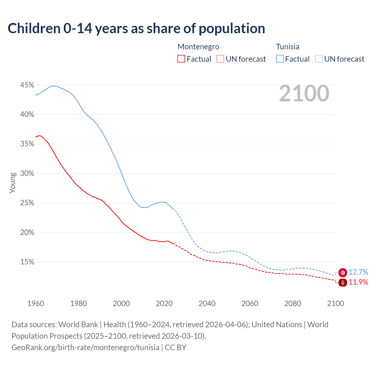 Montenegro has an annual birth rate of 11.2 births per 1,000 people, compared to 13.7 for Tunisia. The average number of children a woman is expected to have during her lifetime — the fertility rate, is 1.74 in Montenegro and 1.83 in Tunisia — 5.29% difference.