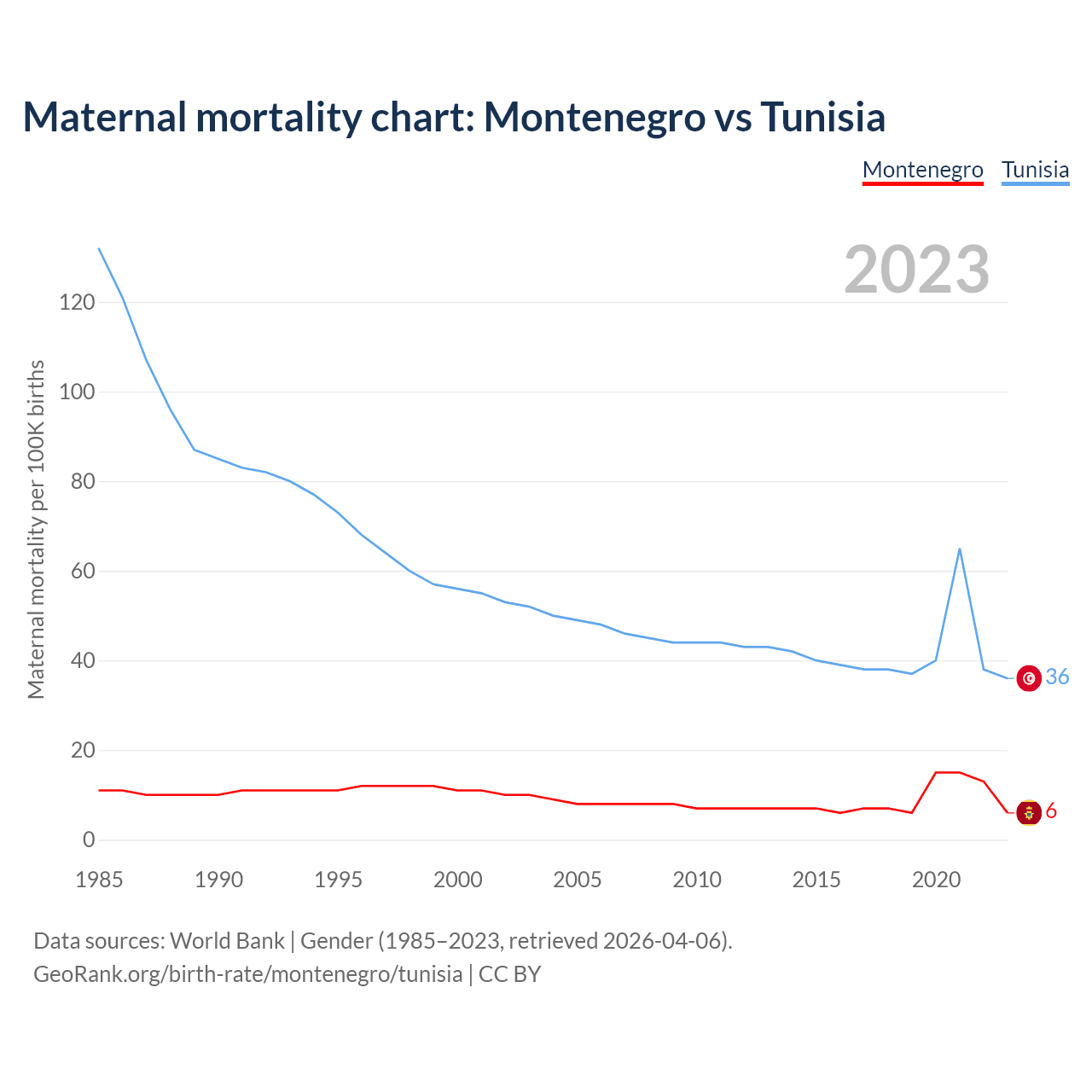 The maternal mortality rate, which is the probability of dying during childbirth or within 42 days of pregnancy termination, is 6 deaths per 100,000 live births in Montenegro, compared to 36 deaths in Tunisia.