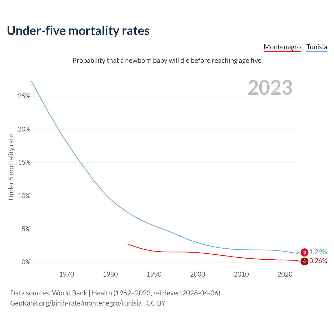 The chance that a newborn baby will die before reaching age five is 0.26% in Montenegro and 1.29% in Tunisia. Above is a chart with historical data on under-five mortality rates.