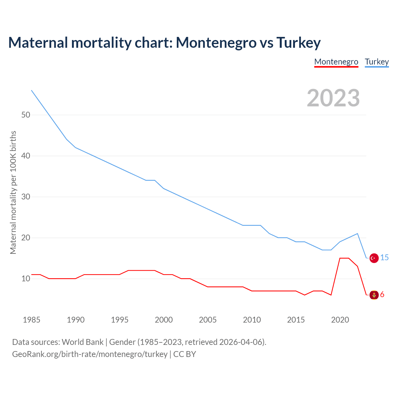 The maternal mortality rate, which is the probability of dying during childbirth or within 42 days of pregnancy termination, is 6 deaths per 100,000 live births in Montenegro, compared to 15 deaths in Turkey.