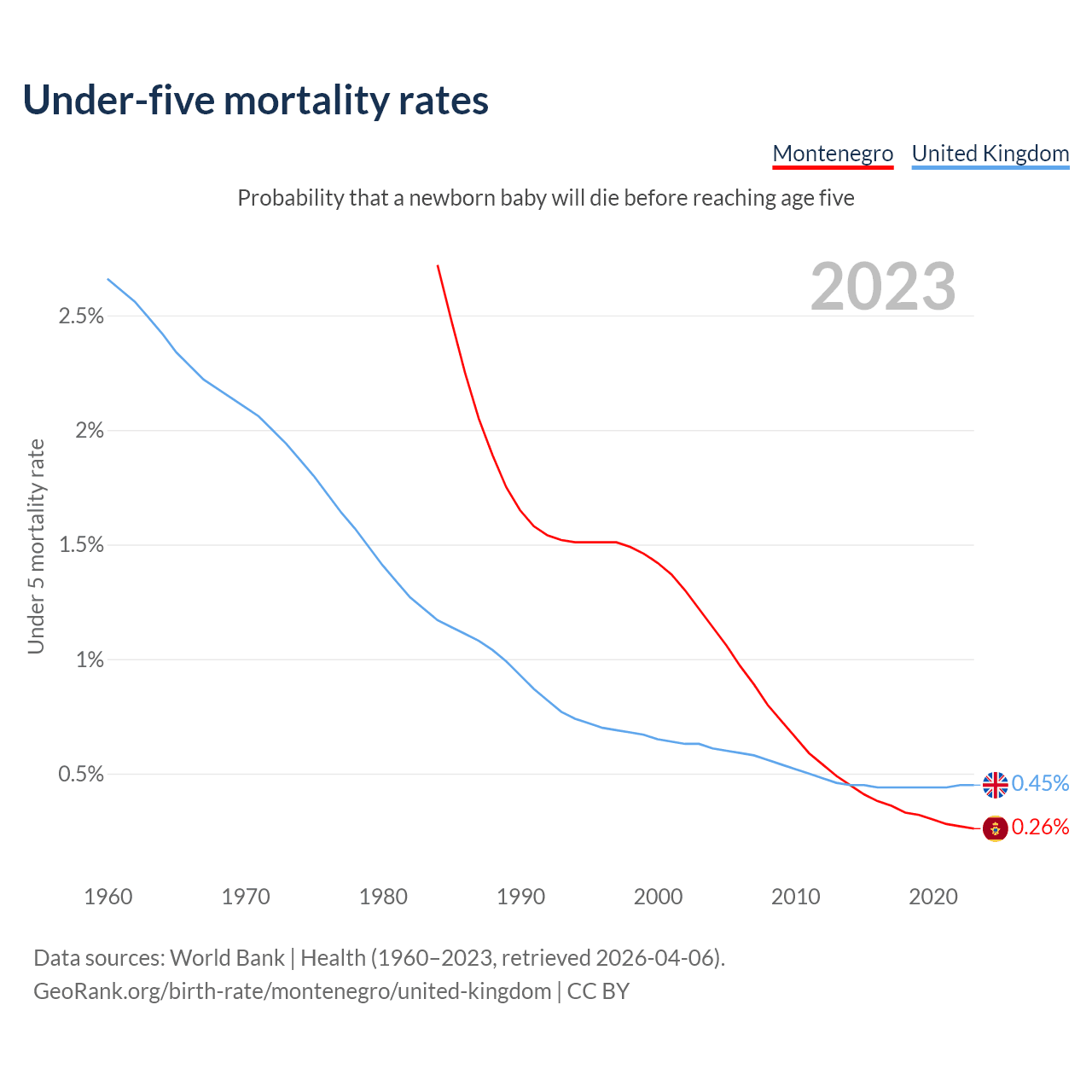 The chance that a newborn baby will die before reaching age five is 0.26% in Montenegro and 0.45% in the United Kingdom. Above is a chart with historical data on under-five mortality rates.